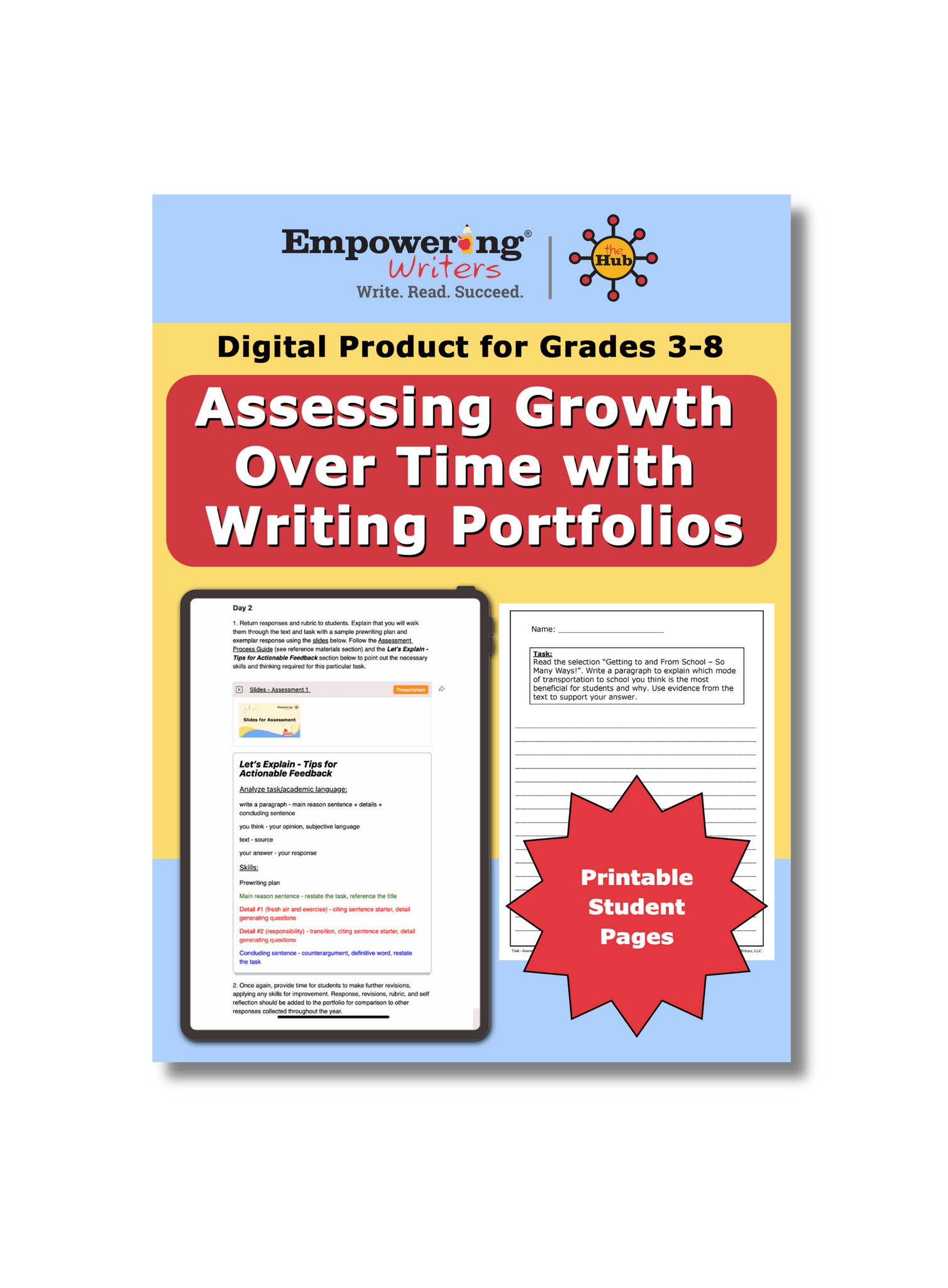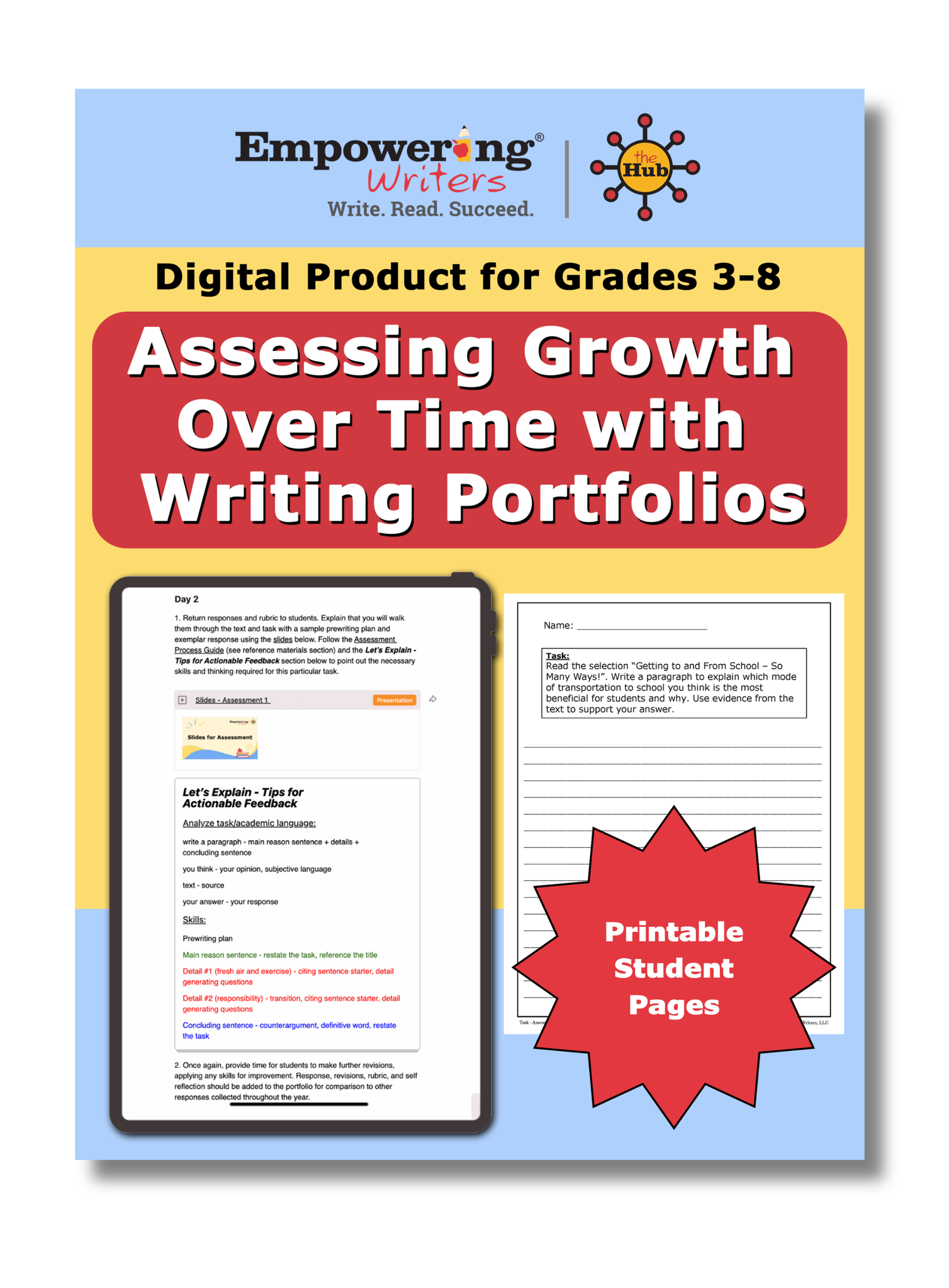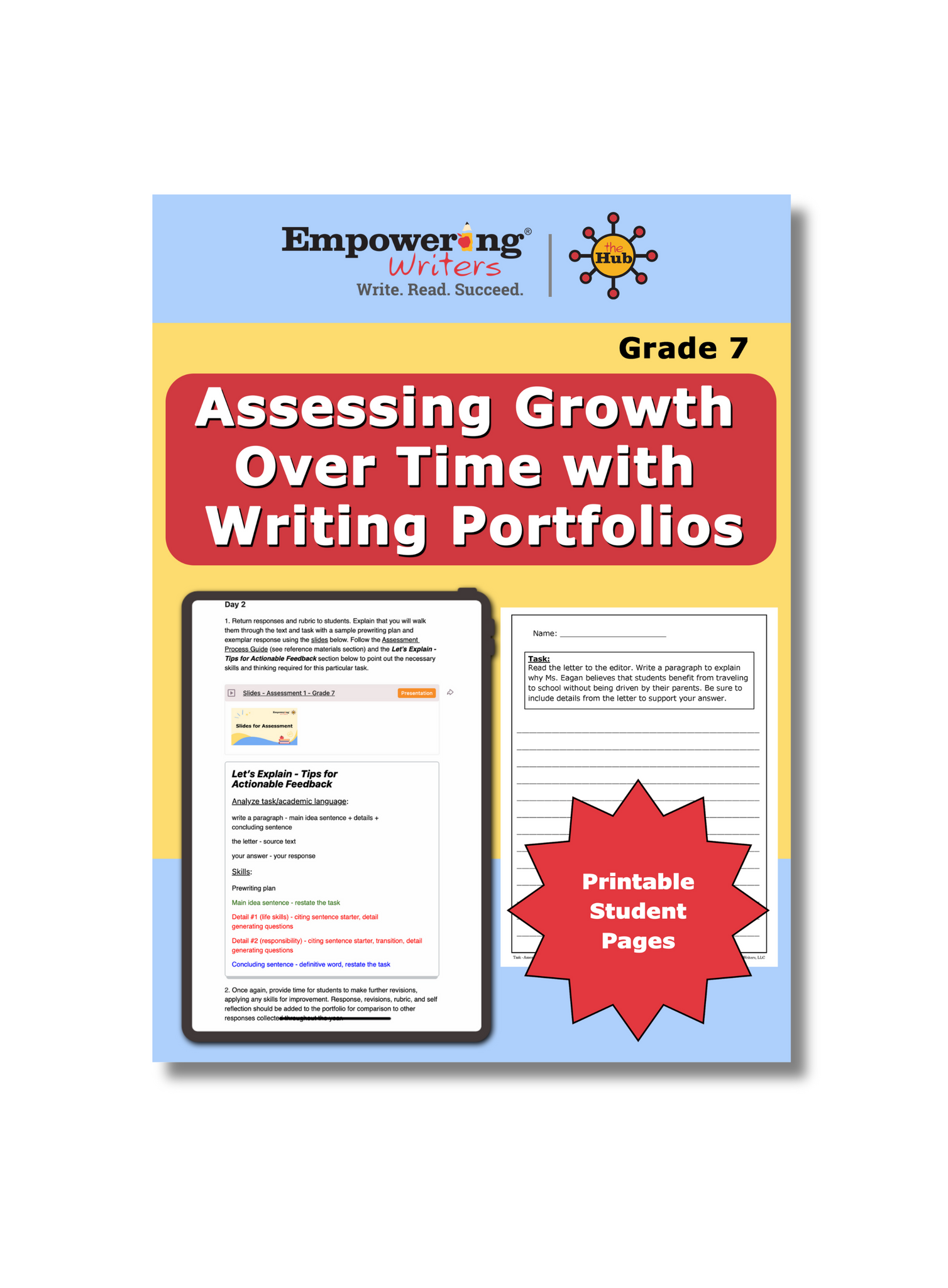 "Assessing Growth Over Time with Writing Portfolios" provides a framework and materials to collect, analyze, and provide actionable feedback to student responses. This digital resource provides 5 assessment opportunities for each grade level, each including a source text(s), task, exemplar response, and detailed analysis for highlighting key skills required for each task. As an extension to the Empowering Writers writing guides, teachers gain the tools they need to deliver targeted feedback, identify next instructional steps, and monitor student progress over time.